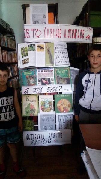 В конце мероприятия ребят познакомили с выставкой «Лето красное и опасное». Работник детской библиотеки методист Гасанова Д. рассказала о том, какие опасности могут предостерегать людей в лесу: о клещах и змеях, полезных и опасных растениях, ягодах и грибах. Познакомила со способами оказания первой помощи при укусах и отравлении ядовитыми растениями. Дети узнали много интересной и полезной информации, как раз, когда начался сезон сбора ягод и растений в наших лесах.