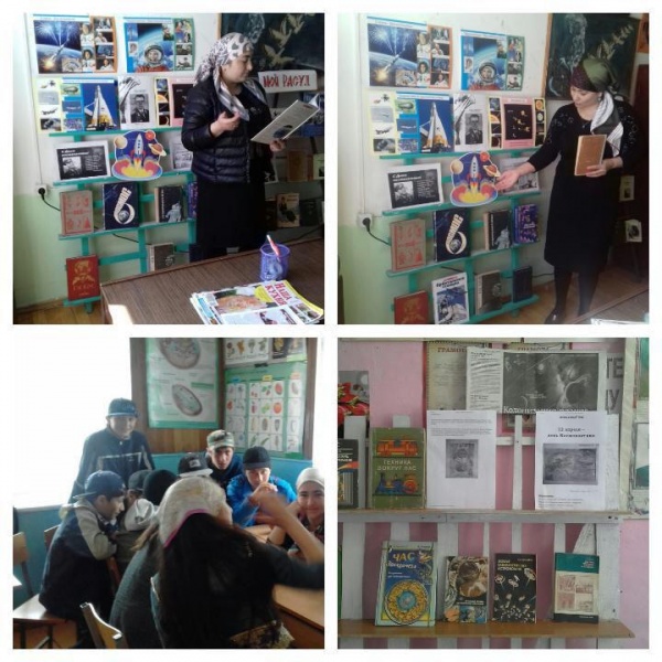 Заведующая читальным залом Шейхова Н.Р. прочитала обзор у книжной выставки, а методист ЦБ провела беседу. Целью проведения таких мероприятий является: расширить знания детей о космосе, об известных космонавтах; познакомить с историей создания ракетной техники; развивать любознательность, мышление, воспитывать гордость за свою страну. Такие мероприятия прошли и в сельских филиалах библиотеки.