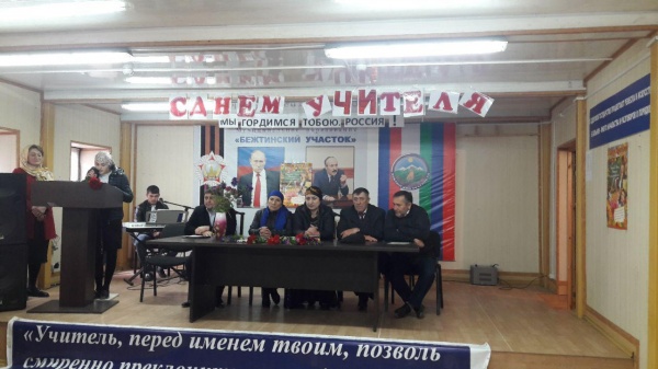 В актовом зале Администрации МО «Бежтинский участок», 4 октября 2017г. состоялось торжественное мероприятие, посвященное Дню учителя, в котором приняли участие руководители образовательных учреждений, педагоги школ, ветераны педагогического труда, молодые учителя. Открыла и вела праздничное мероприятие конферансье МО «Бежтинский участок» Наизат Магомедова. Гостями праздника стали заместитель главы администрации Муса Мусаев, начальник отдела образования Патимат Шахбанова, начальник отдела культуры Джамилат Курбанова, представители СМИ. В ходе проведения мероприятия в адрес педагогической общественности МО «Бежтинский участок» прозвучало множество добрых, теплых, искренних слов. После официальной части состоялся праздничный концерт, где выступили заслуженные работники культуры МО «Бежтинский участок» Зухра Шахмилова, Магомед Омаров и Насир Джалилов.