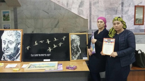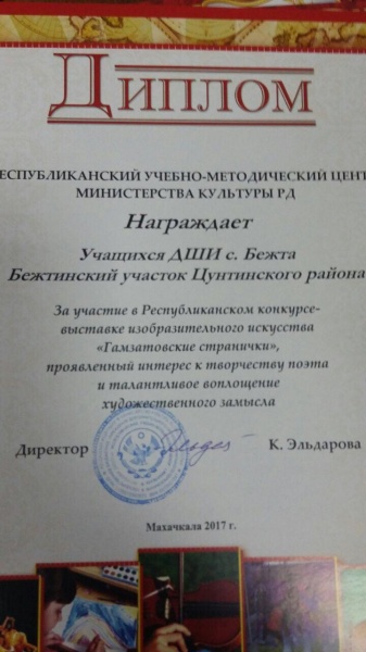 Сегодня, 2 ноября 2017г.  в национальной библиотеке им. Расула Гамзатова в г. Махачкала прошел Республиканский  конкурс-выставка изобразительного искусства  "Гамзатовские странички", в котором в номинации "апликация" учащиеся ДШИ МО "Бежтинский участок" заняли призовое место и были награждены дипломом.