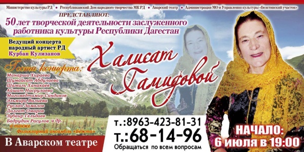6 июля 2017г. в 19:00 в Аварском театре г. Махачкала состоится концерт, посвященный 50 летию творческой деятельноти заслуженного работника культуры Республики Дагестан Халисат Гамидовой.