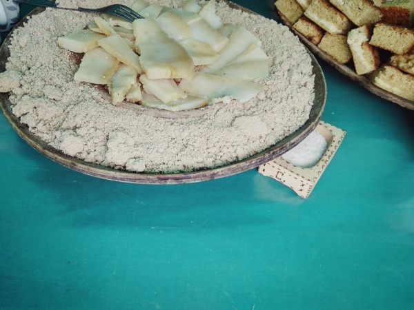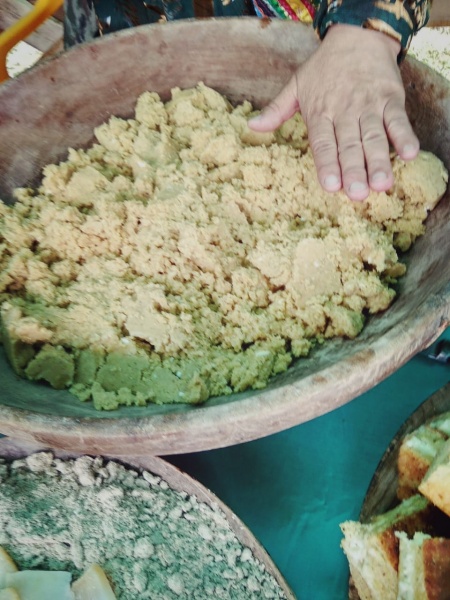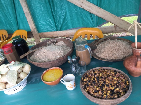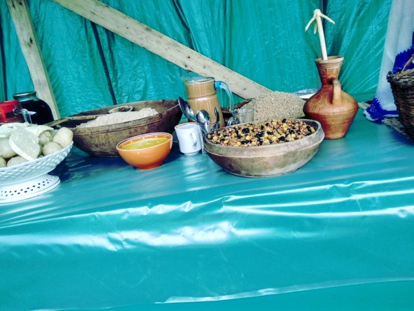 На организационном собрании актива Джума мечети с. Бежта имам мечети Абдурашид Будунов предложил приготовить к маджлису национальные бежтинские блюда, чтобы гостей познакомить с кухней бежтинцев. Решено было пригласить Детскую школу искусств с. Бежта с куклами в национальной одежде и утварью, которыми пользовались наши предки. Продукты, блюда, костюмы могут рассказать о многом: об укладе жизни, о промыслах, предпочтения, о географическом расположении нашего участка. Организацией этой сложной ответственной задачи занялась Магомедова АшуратРамазановна, которая блестяще справилась, в чем мы все убедились. Она поручила каждому округу готовку того или иного блюда и наказала женщинам принести на майдан, наготовленное к 9 ти часам утра, чтобы гости по пути к президиуму успели вкусить и оценить наши национальные блюда. Презентовала кулинарные блюда Магомедова Эльмира Абдухаликовна, которая охотно отвечала гостям на вопросы о составе блюд и способе их приготовления. Несмотря на дождь и слякоть кухня начала свою работу еще на заре. Всех, кто шел  на майдан, встречал волонтер с подносом горячего, дымящегося напитка «кьи».